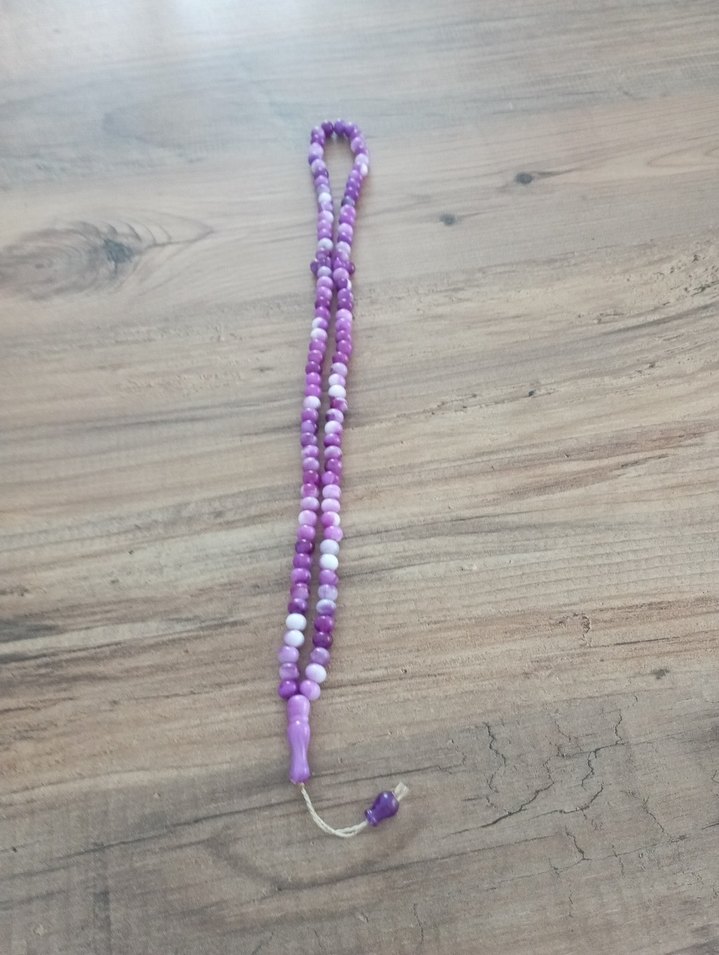 Mor renkli, renkli ve bohem tarzda tasarlanmış boncuklu tesbih. Boncuklar canlı bir desende dizilmiş ve püsküllü uç bulunur.