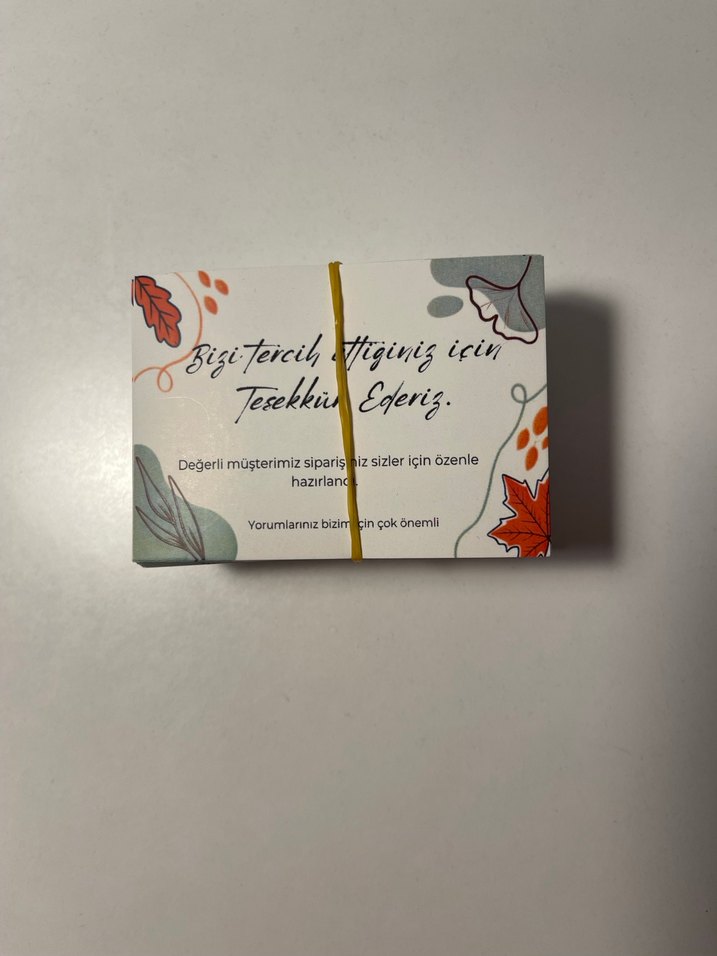 Müşteri tercihi için teşekkür eden, yaprak desenli ve özel tasarımlı küçük bir kart.