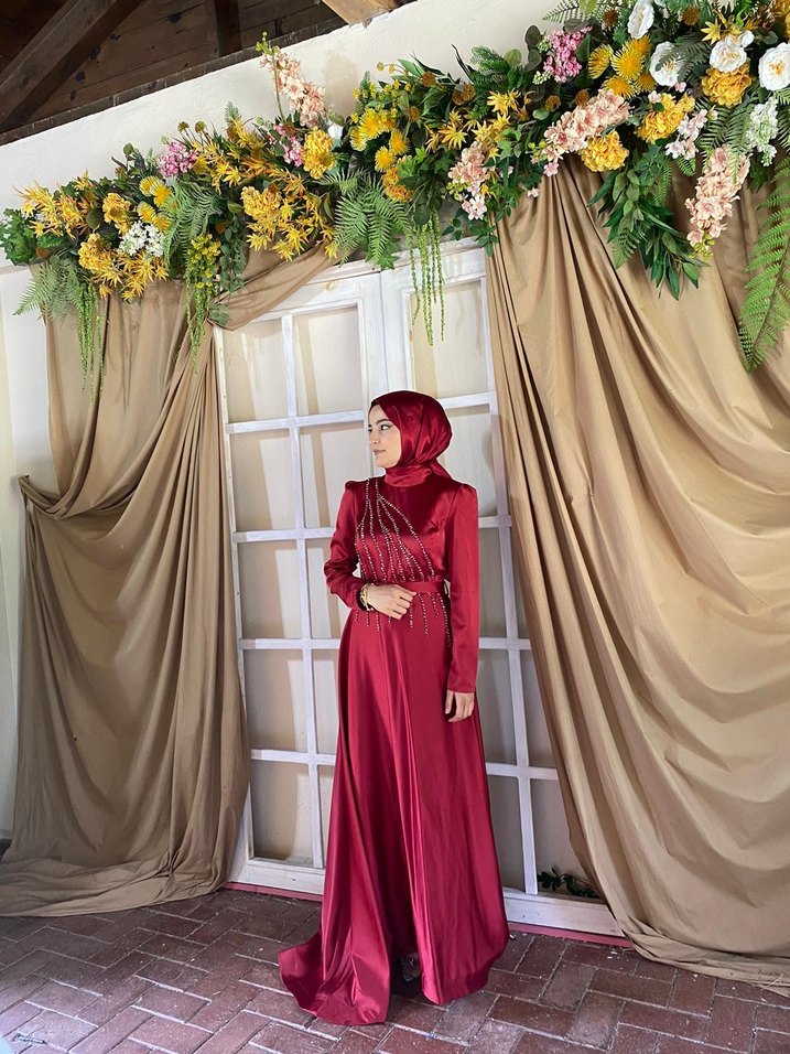 Bordo renkli abiye elbise, yüksek yakalı ve uzun kolludur. Drapeli tasarımı ve parlak dokusuyla düğünler için uygundur.