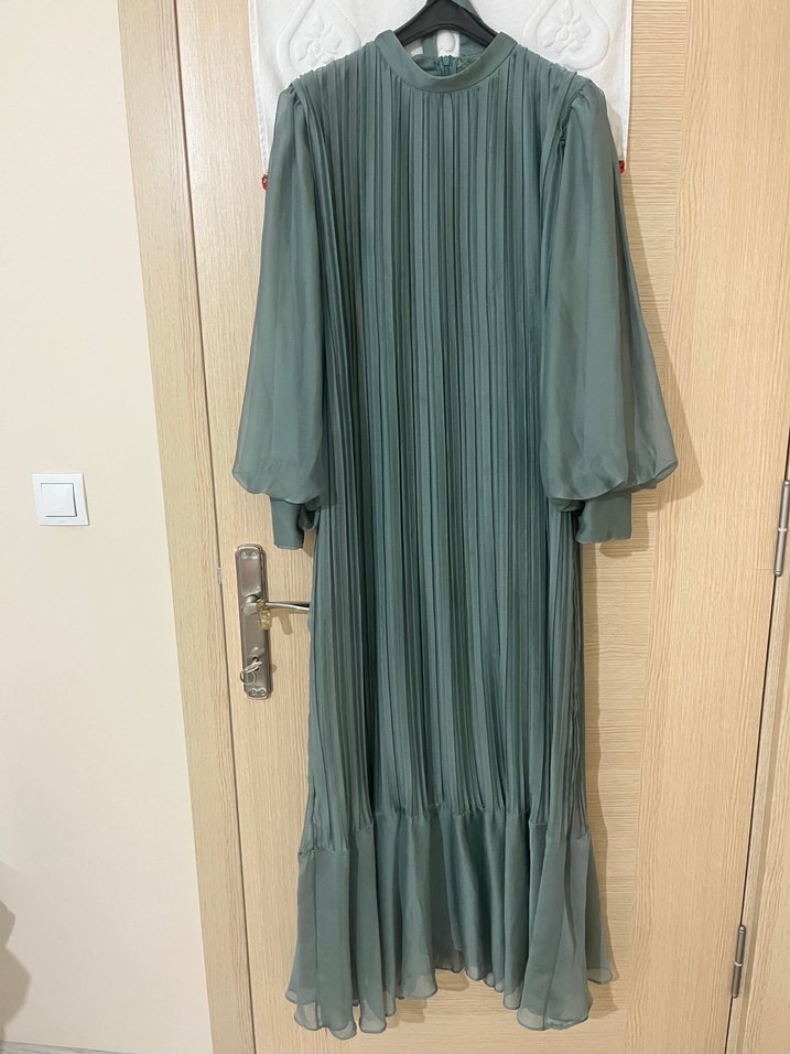 Bu uzun yeşil elbise, piliseli detaylar, yüksek yaka ve bol kesim uzun kollara sahiptir. Saten elbisedir mint yeşilidir