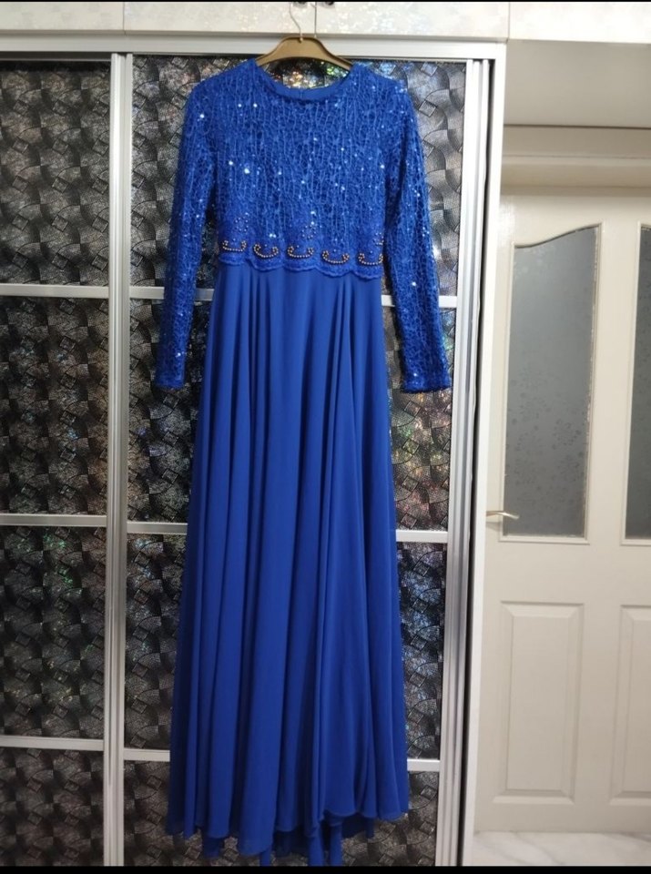 Uzun kollu ve yuvarlak yakalı mavi abiye elbise, işlemeli payet detaylı üst kısmı ve drapeli etek kısmı ile şık bir duruş sunar. Düzenli kesim, düğünler için uygundur. Ürün 2 defa kullanıldı.Herhangi bir deformesi bulunmamaktadır