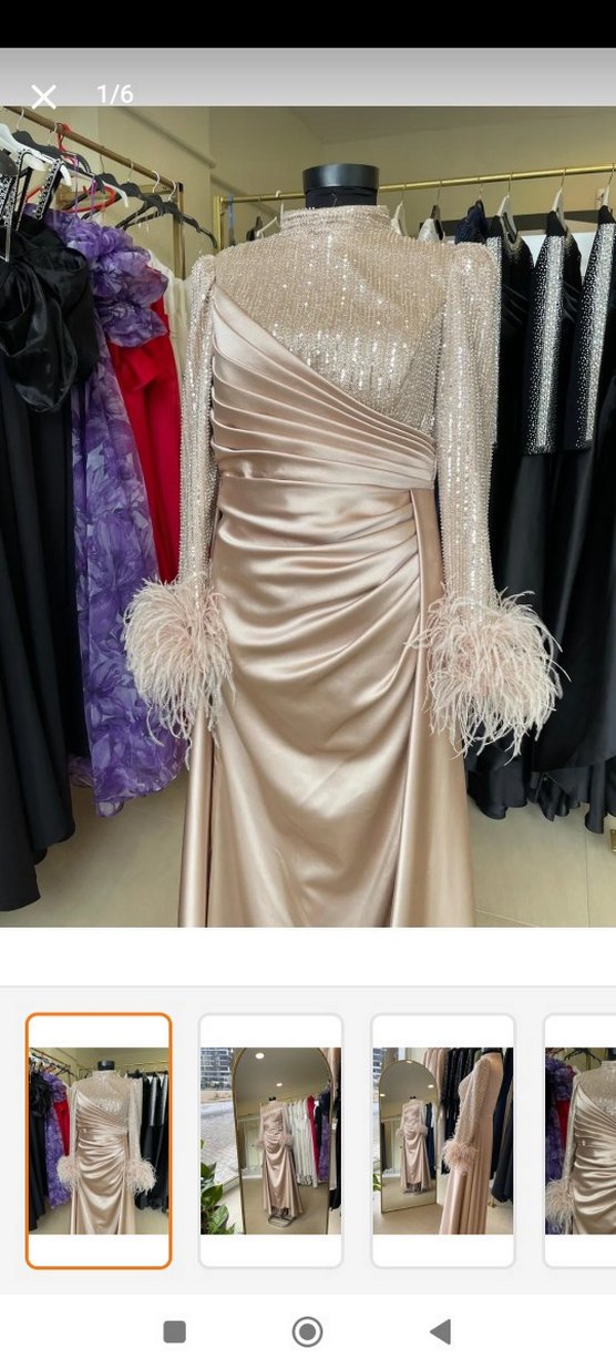 Bej renkli, drapeli ve işlemeli uzun abiye elbise. Uzun kollu, straplez yaka ve kuğu tüyü detaylı, klasik ve şık bir tasarım. 40-42-44 beden uyumludur