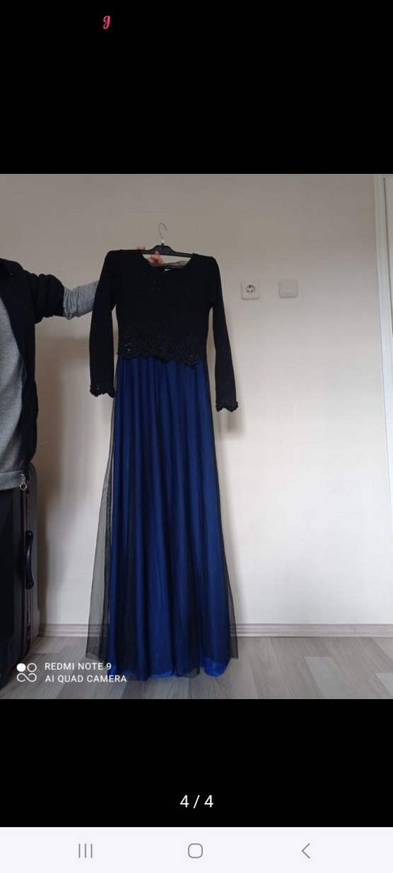 Bu uzun kollu, vücuda oturan lacivert elbise, siyah üst kısmı ve yuvarlak yakasıyla gotik ve sade bir görünüm sunar. s beden uyumlu