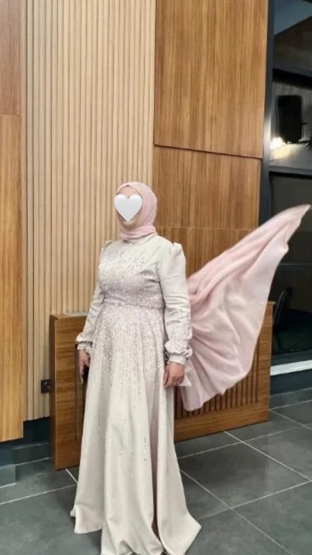 Bej renkte, yüksek yakalı ve uzun kollu, drapeli ve regular fit abiye elbise, tesettürlü ve gösterişli düğünler için uygun. Sadece 1 saat giyildi şalı 3 bucuk metre şal dahil fiyat