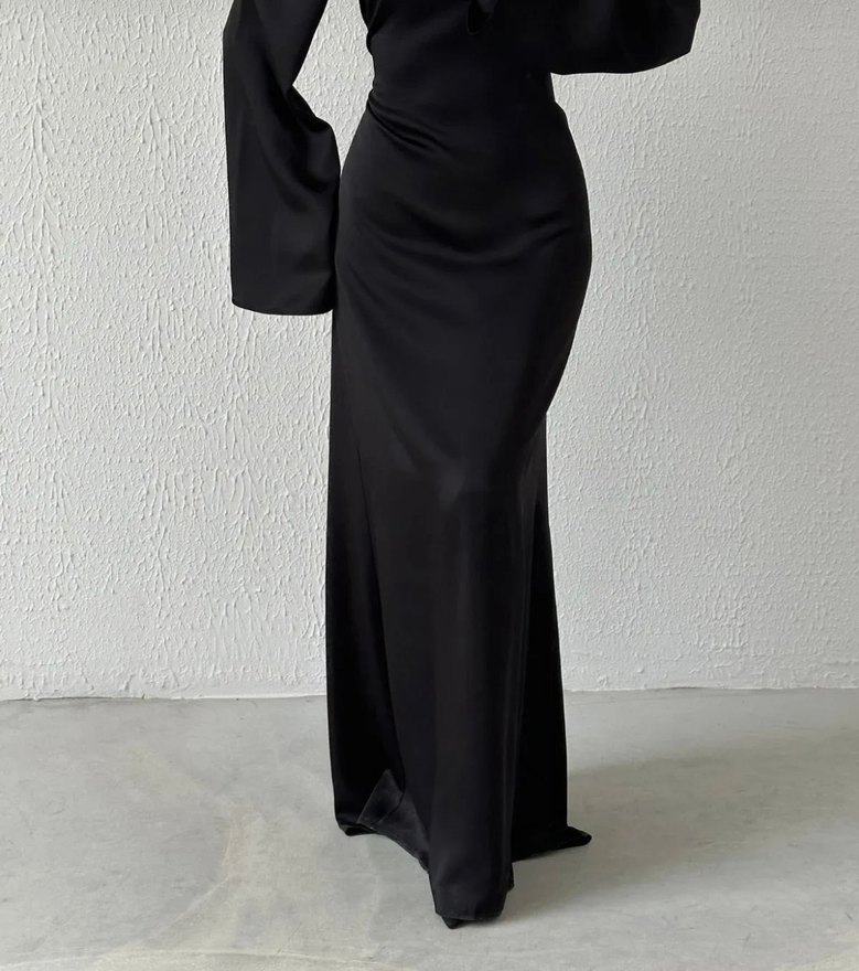 Siyah uzun elbise, uzun kollu, düzenli kesim ve dökümlü tasarıma sahip ipeksi kumaftan klasik şıklık sunar.