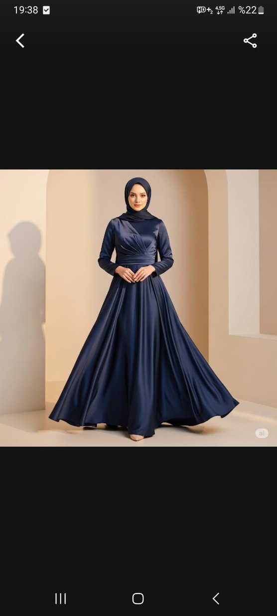 Parlak lacivert kumaştan, drapeli detaylı, uzun kollu ve tek parça uzun abiye elbise. Tekne yakalı, modest ve çağdaş kesimle düğünler için uygundur. ✨