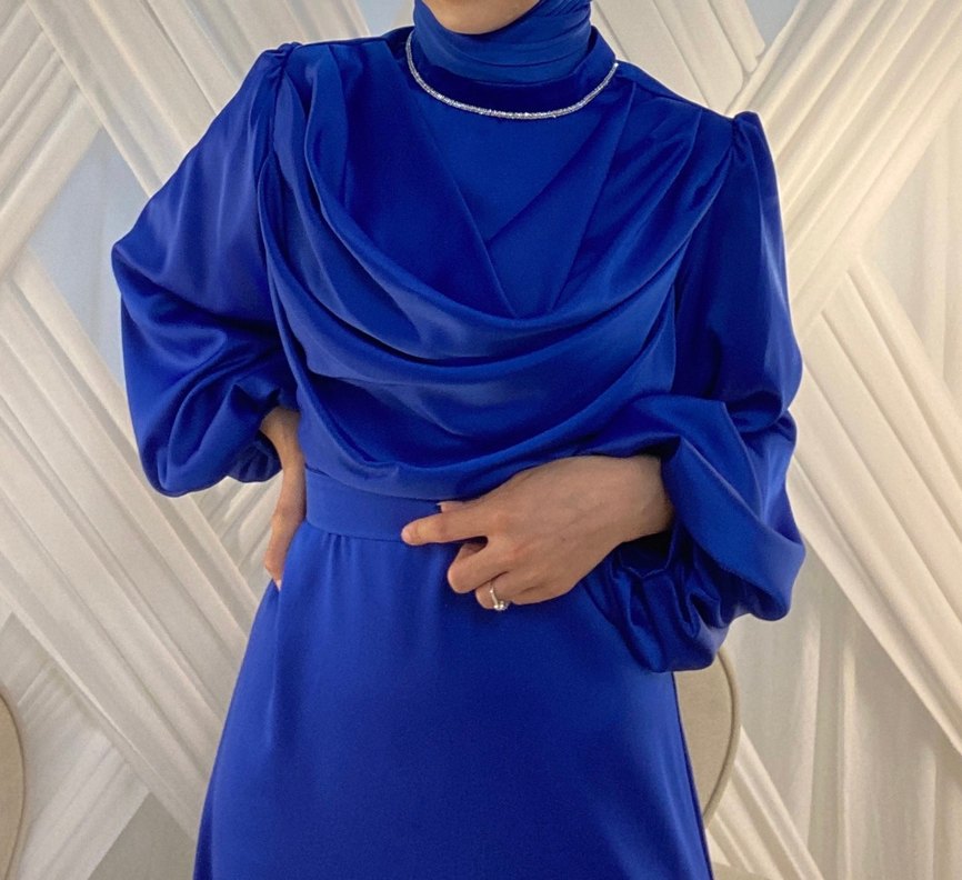 Parlak mavi kumaştan, yüksek yakalı ve drapeli tasarıma sahip uzun kollu, beli oturan abiye. Son fotoğrafta da eklediğim gibi arka kuyruk ucunda topukla basmaktan kaynaklı bi kaç noktada renk açılmış. Yırtık yada delik değil sadece renk açıklığı. Ben çok yakından çektiğim için böyle ama giyince belli olmuyor.