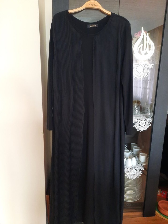 Uzun siyah elbise, pilili detaylı ve uzun kolludur. Notlu yaka ve ipeksi kumaşıyla minimalist, gotik tarzda, küçük bir defosu var ancak giyince belli olmuyor son fotoğrafta belirttim. M beden yazıyor ancak 50 bedene kadar oluyor. Çok az giyildi