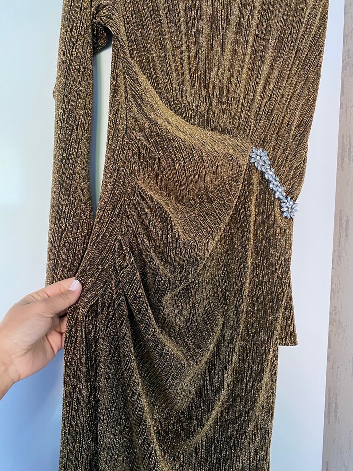 Parlak kahverengi kumaştan, drapeli ve uzun kollu, dar kesim uzun abiye elbise. Düğün ve çağdaş tarz sevenler için uygun. ✨