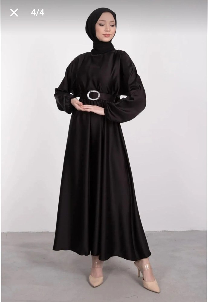 Yüksek yakalı, uzun kollu ve kemerli bel detayıyla bol kesim siyah uzun elbise, sade gotik tarzda günlük kullanıma uygundur. 1 defa kullanildı 85 kg kadar olur