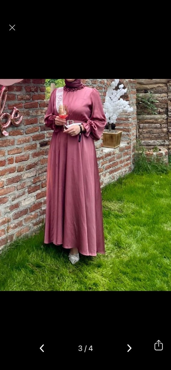 Uzun boy, yüksek yakalı ve uzun kollu, satenimsi kumaştan yapılmış, bol ve drapeli fitli burgundi renkli elbise. Parlak yüzeyi ve mütevazı bohem stiliyle düğünlere uygundur.