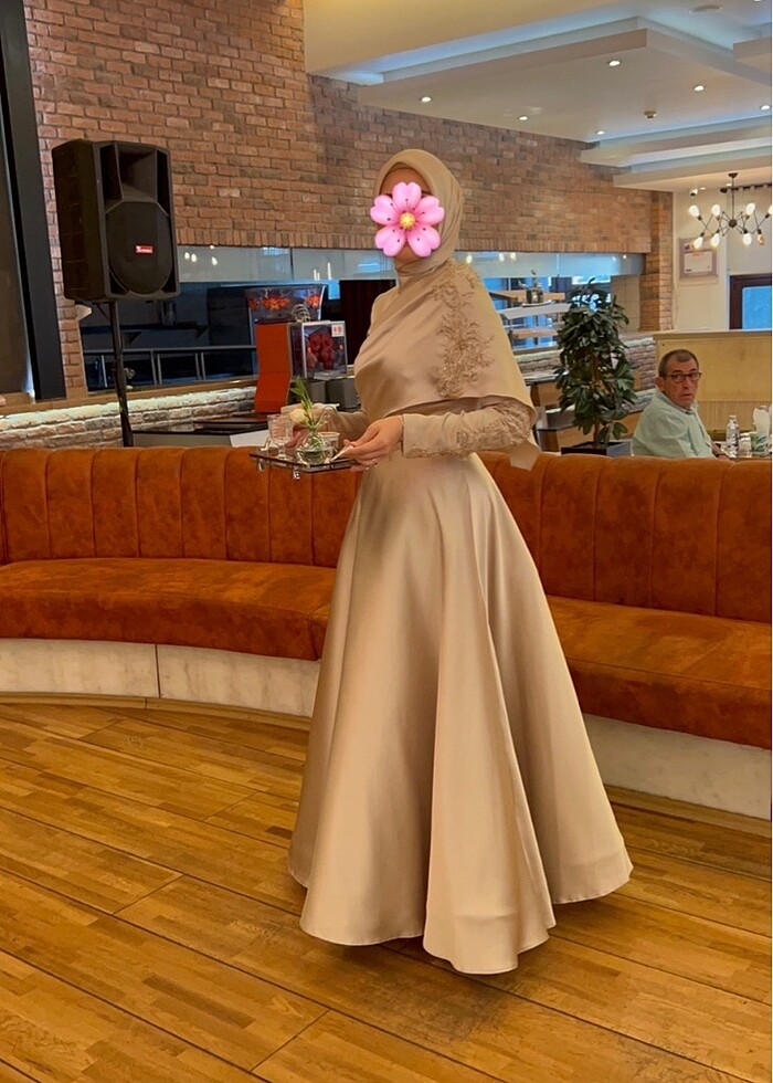 Sadece bir kez nişanımda giydim. Bursa’da bir mağazadan almıştım. 38 beden. Gold-rose’a yakın bej gibi bir renk İç kısmının görünmeyen yerinden bone yapmak için ufak bir parça kestik ancak elbiseyi etkileyen bir durum değil.