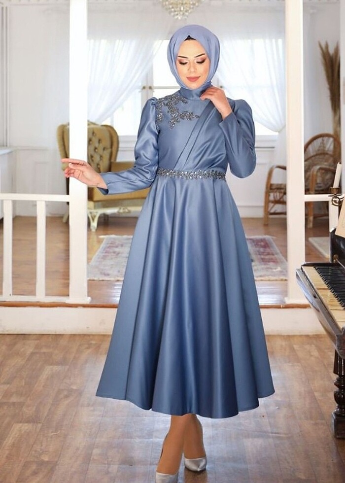 Indigo mavisi fotoda biraz açık renk çıkmış tam Indigo mavisi bir abiye etiketli. Son fiyattır
