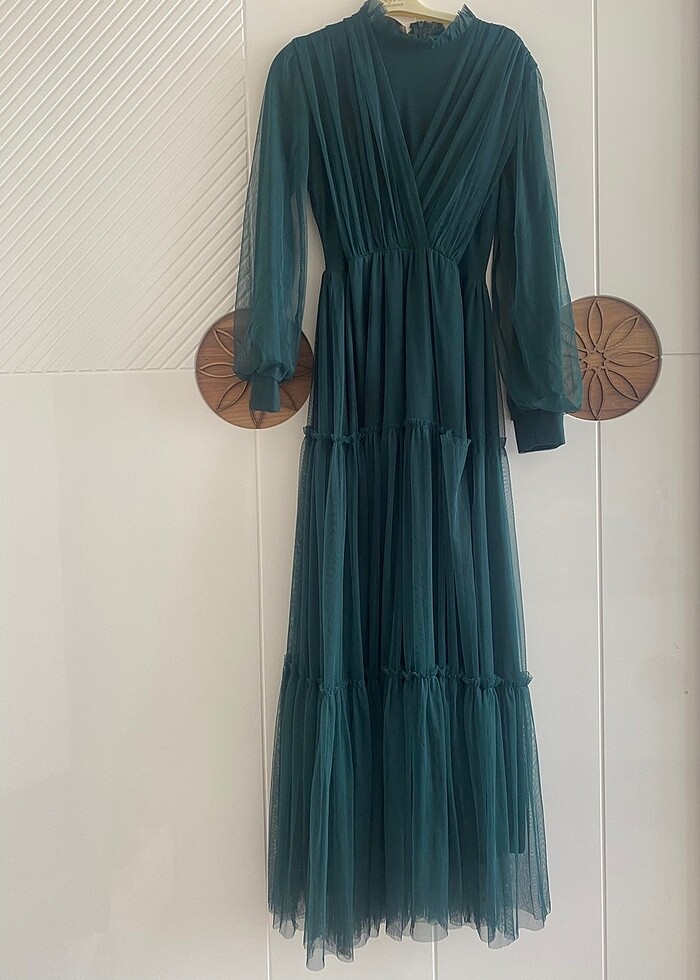 İki kez giyildi. Ufak bir söküğü var elle dikilebilir. Çok şık dökümlü bir abiye. İsteyen olursa türban tülü de vardır beraber göndereceğim.
