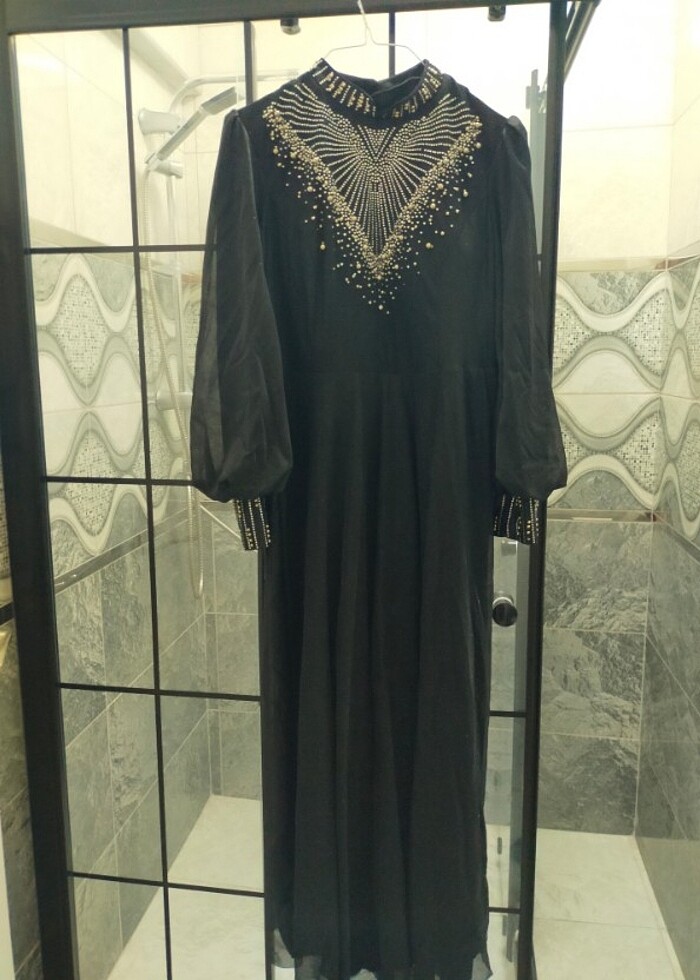 Ürün bir defa kullanıldı kumaşı simli ön kısmı ve kolları inci ve taş detaylı bel kısmı kuşak detaylı abiye