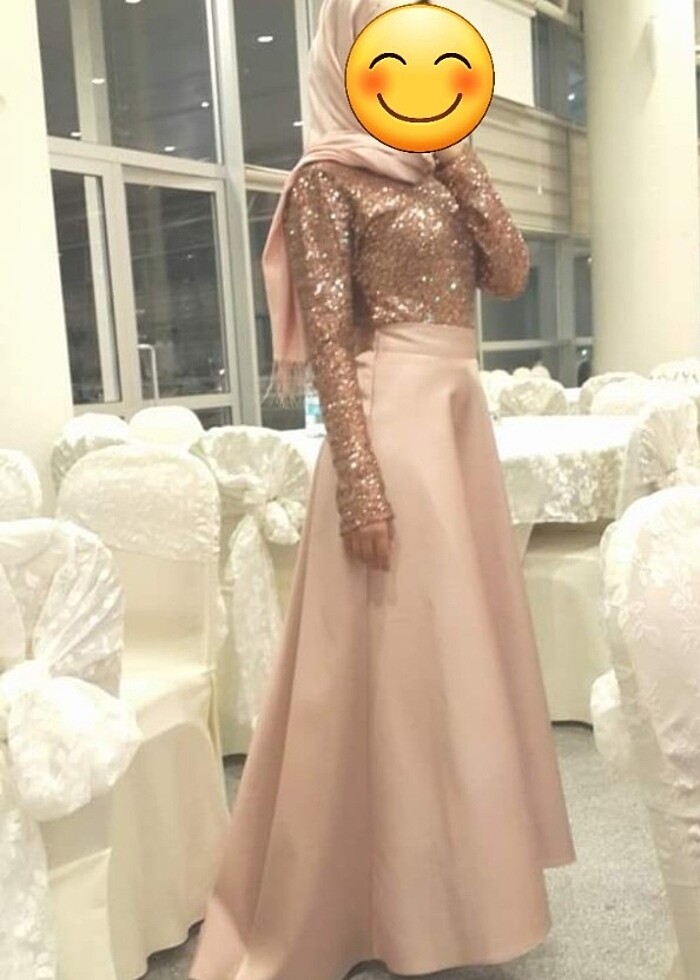 Iki parçadan oluşan üstü payetli eteği tafta kumaş ve kuyruklu