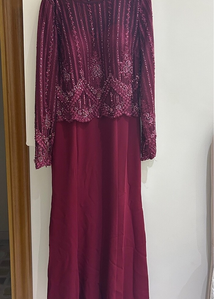Bedrin marka. Bir kez giyildi. Üst kısmın içinde kumaş var iç belli etmez. Hafif kuyruklu. Boy 150cm Koltuk altı arası 50 cm