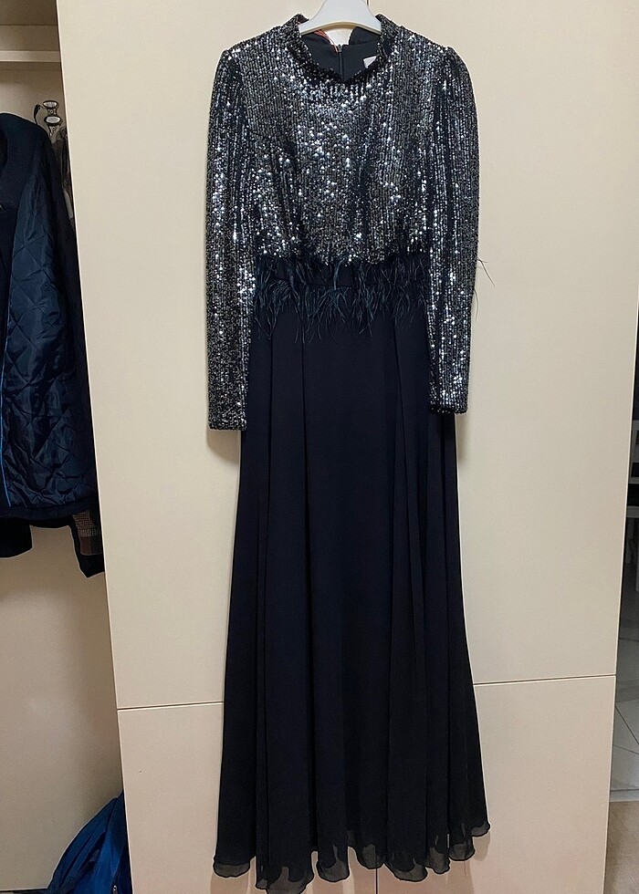 Ürün birkaç kez kullanıldı ama herhangi bir deforme mevcut değildir,dökümlü çok şık bir eteği, pullu ışıl ışıl bir üstü var.
