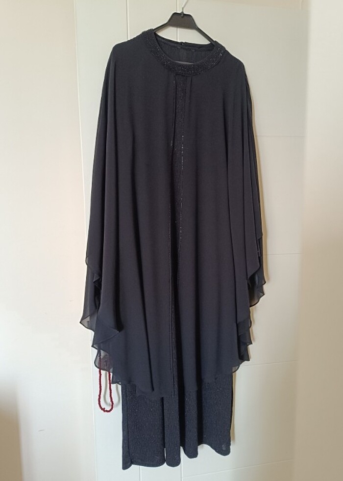 Ürün 2 defa kullanıldı . Üstündeki pelerin seyyardır çıkartılabilir .İç elbisenin kolu vardır. Bedeni 3Xl tır.