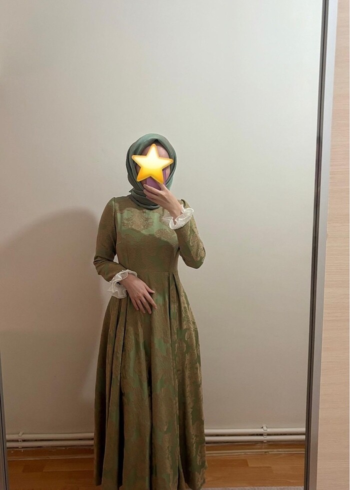 İnce brokar kumaş yeşil renkte özel gün elbisesi. 36-38 beden için uygundur.