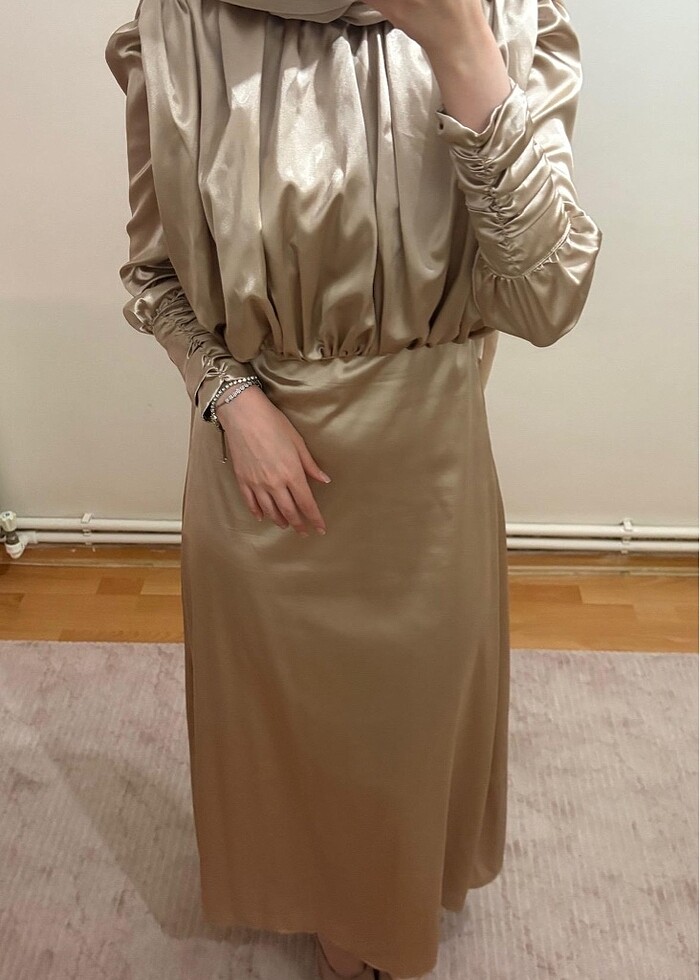 Bej renginde saten tasarım elbise. 36-38bedene uygundur.