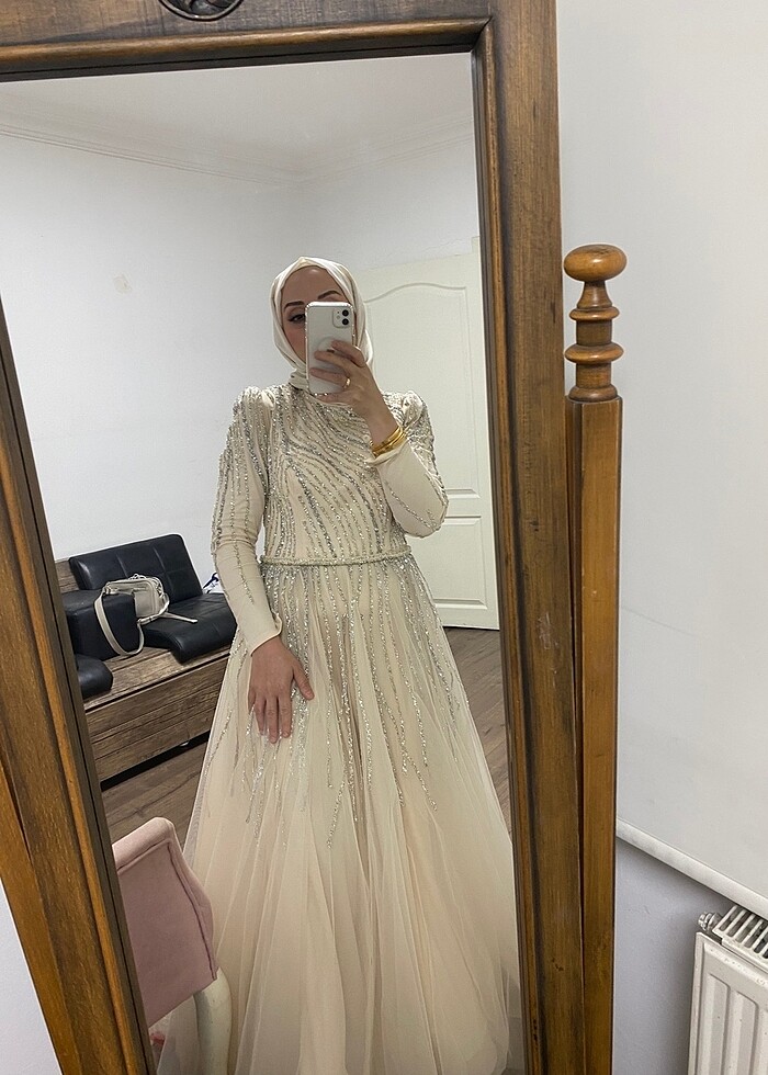 Yeni etiketli 15 Haziran sonrası satılık kardeşim düğün de giyip satacağım 38 beden rengi taş rengi olarak geçiyor hennin marka boyu 140 cm benim boyum 155 kg 58 topuklu ile giydim 60 kg ya kadar olur