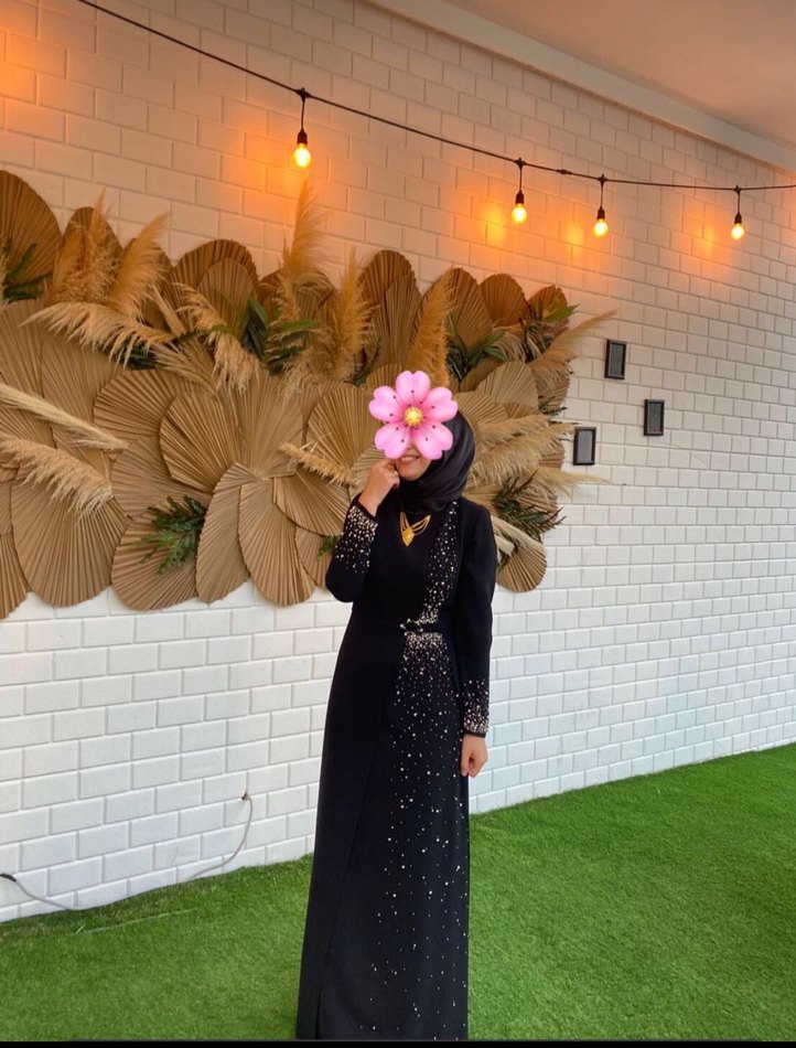 Bu siyah, uzun kollu ve yüksek yakalı elbise, boncuk işlemeli çiçek desenlerine sahip, pürüzsüz sentetik kumaştan yapılmıştır. Düğünler için uygundur. 42 beden uyumlu 165 boyunda 63 kiloda giyildi