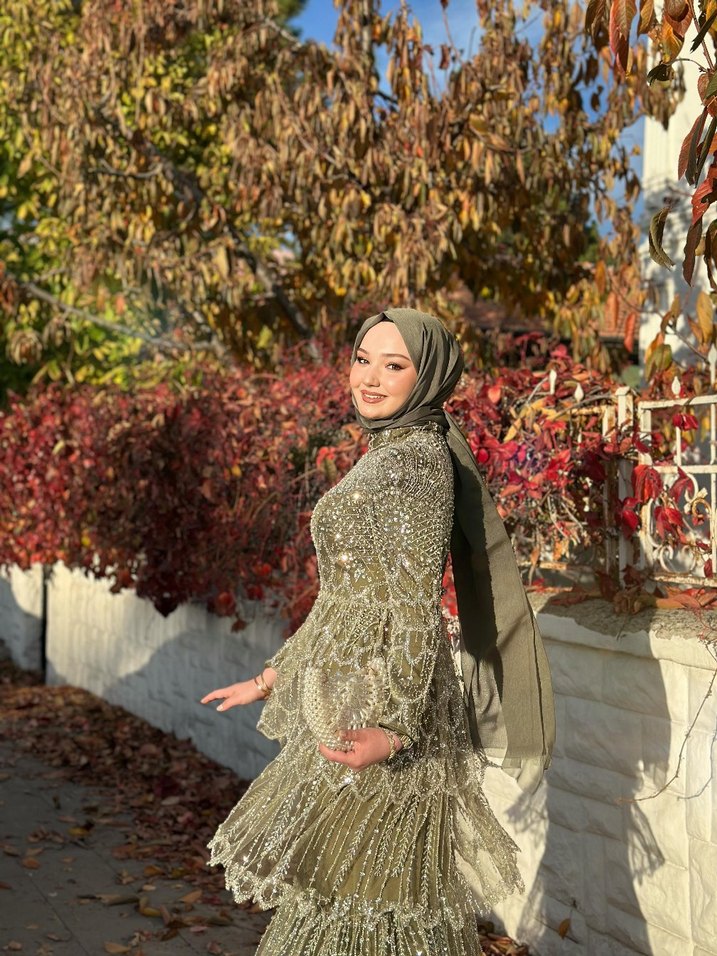 Açık haki renkli, uzun kollu, yüksek yakalı ve bol kesimli bu abiye elbise, etnik desenler ve drapelerle süslenmiştir, düğün için uygundur. 36-44 beden uyumludur.Musaitlik durumu sorunuz