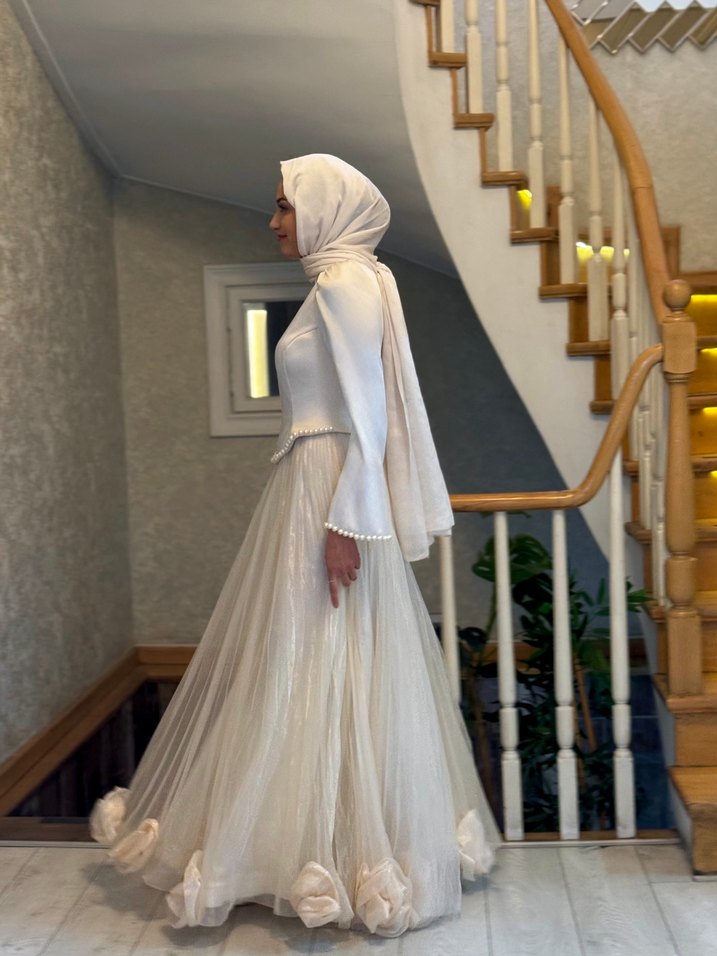 Uzun beyaz nişan elbisesi, yüksek yakalı, uzun kollu ve drapeli tasarıma sahiptir. Salaş kesim ve sade deseniyle tesettüre uygundur. 36-38 beden uyumlu. Kiralık fiyatıdır