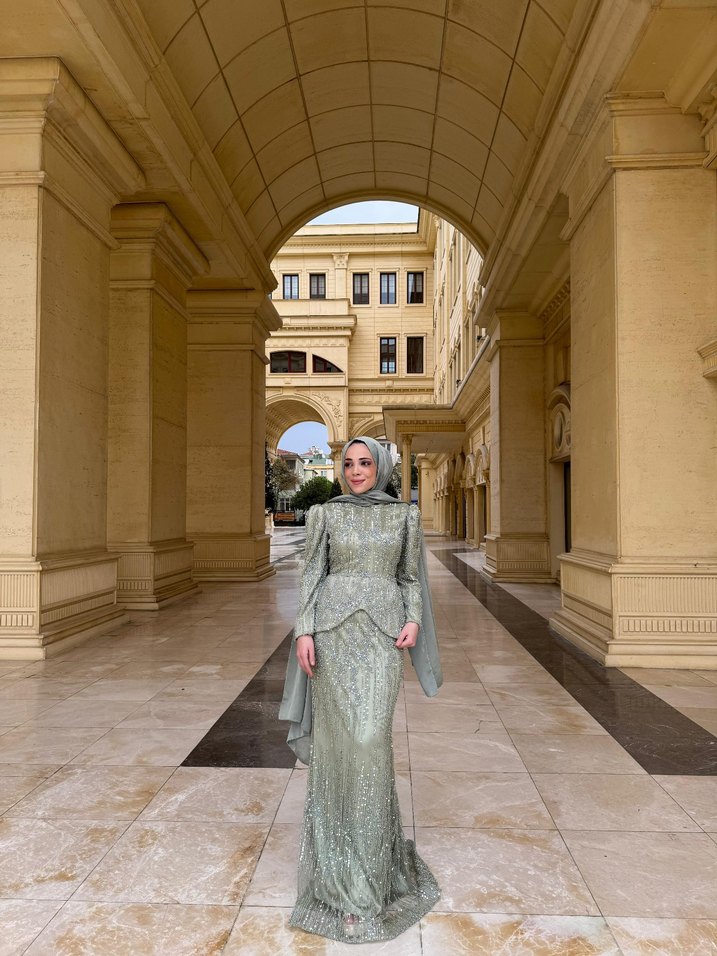 Yüksek yakalı ve uzun kollu, etnik desenli uzun haki abiye elbise. Mütevazı, regular fit ve drapeli detaylara sahip, düğünler için uygun. ✨ Abiyemiz 36 38 40 42 beden uyumludur arkası ipliklidir 3.500'dir müsaitlik durumunu sorunuz ✨