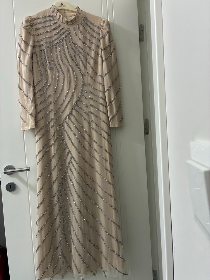 Bej renkte, uzun kollu ve yüksek yakalı işlemeli abiye elbise. Hiçbir sorunu yok. İki koltuk arası 60 cm