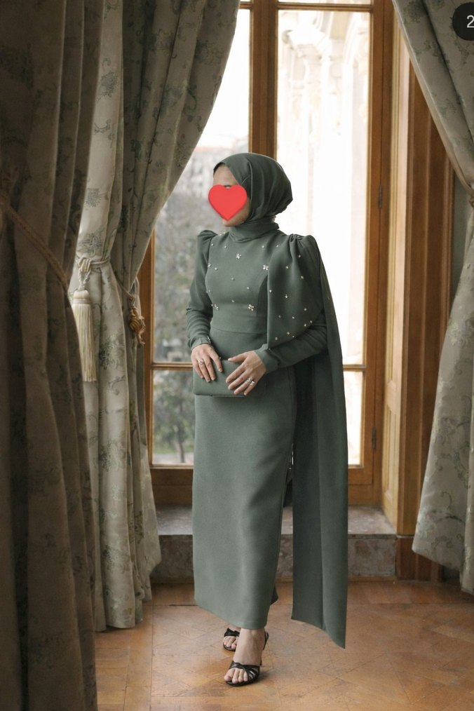 elbise boyu 140 santim omuzdaki parça bilek boyu yakındır saten kumaştır astarsızdır rengi adaçayı yeşili 36 44 arası her beden mevcuttur