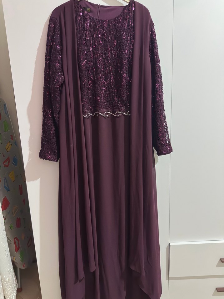 Mor uzun abiye elbise, drapeli ve bol kesimdir. Uzun kollu ve straplez yakalı, klasik ve gösterişli bir görünüme sahiptir. Düz, gelinlik için uygun.