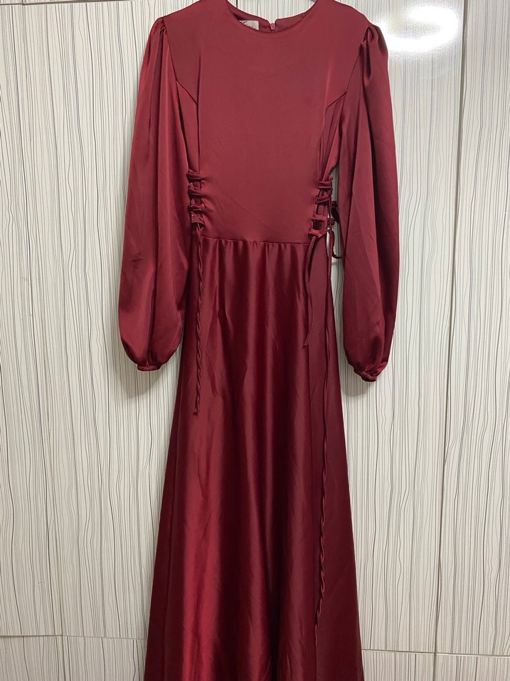 bordo uzun elbise, yüksek yaka ve askılı kollarla, ipeksi saten kumaştan drapeli detaylara sahip, düğünler için uygun klasik şıklıktadır. 1 kere giyildi.