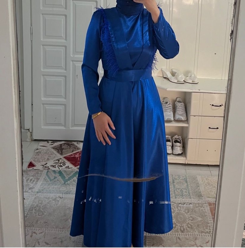 Yüksek yakalı, uzun kollu ve drapeli detaylara sahip mavi uzun abiye elbise. Parlak ve desensiz kumaşıyla düğünler için uygundur. ✨