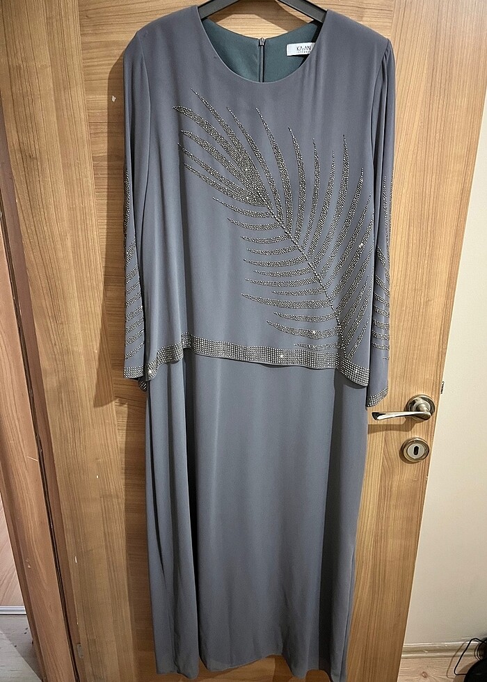 Ürün sadece bir defa giyildi deformesi yoktur rengi antrasit gridir üzerindeki tül elbiseye birleş iktir gayet kullanımı rahattır standart beden şeklinde düşünülebilir üzerindeki Taşlar yıkamada düşmez