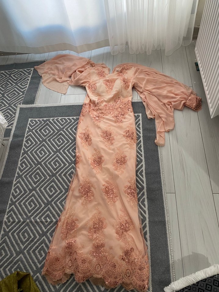 Pembe renkte, işlemeli ve drapeli detaylara sahip, uzun ve dar kesim vintage abiye elbise. Tekne yaka ve uzun kolludur, düğünler için bohem klasik şıklık sunar. 36bedene uygun