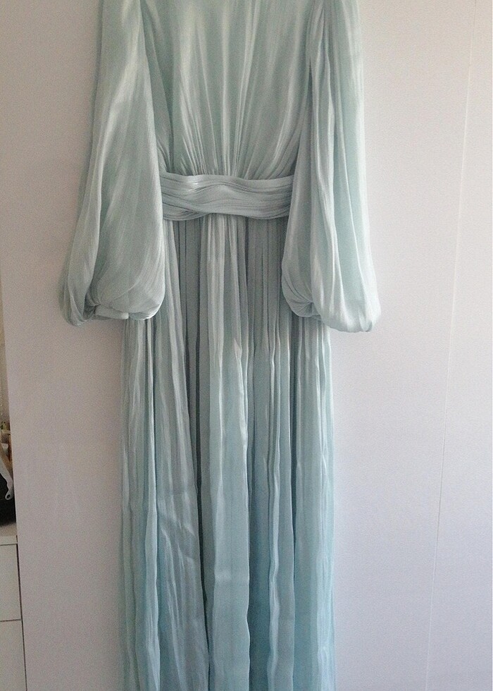 Rengi su yesili / çok açik mavi tonlarinda bir tesettür abiye elbise. Kumasi sifon gibi.hafif ve parlak bir kumas.Sadece 1 gece nisanda giyinildi hiçbir deformesi yok ve terzilik vs yok orijinal haliyle gönderilecektir. 44 beden. Sali ile beraber gönderilecektir. Zühre magazasindan alinmistir.