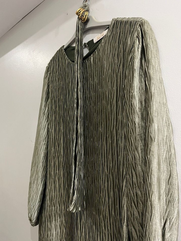 Açık yeşil renkte, uzun kollu, dokulu kumaş uzun elbise. Rahat kesimli, günlük kullanıma uygun, özel günlerde de rahatlıkla kullanılabilir. Çok az kullanıldı. Eşarp ile gönderilecektir. Tonları birbiriyle aynı fotoğrafta biraz farklı çıkmış