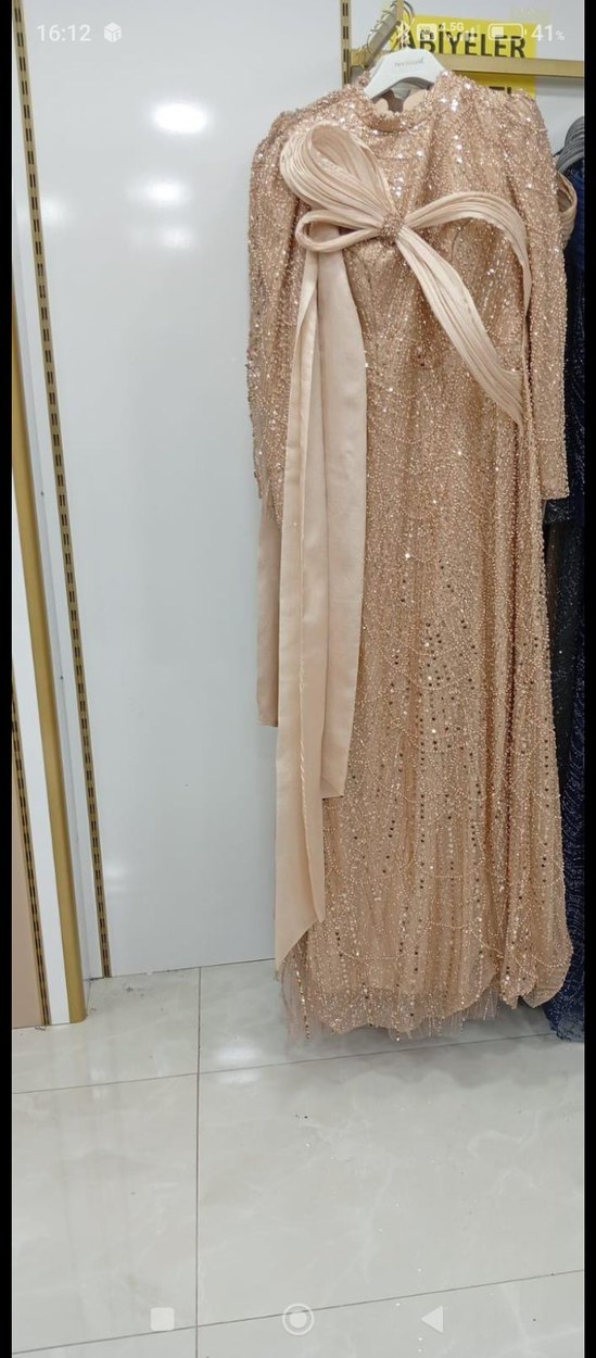 mağazadan alındı boncuk pul işlemeli bir kez giyildi 3 saat 44 beden yazıyor ama 40 42 bedene olur kalıbı dar boyu 140 cm göğüs ölçüsü 48 cm göğüs petli bel olçusu 42 cm arkaya da o kumaş parçası geliyor çok şık bir abiye