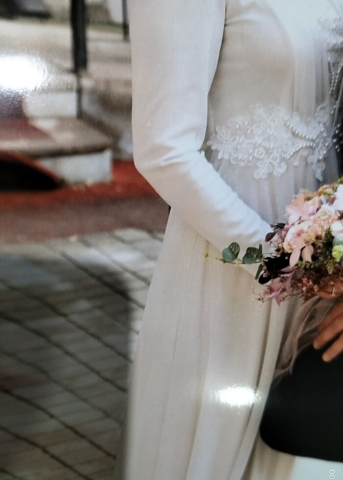 nikah abiye, sünnet annesi gece elbisesi, tesettür abiye, 1 kez isteme ve nikah günü tek gün içinde giyildi. Kuru temizleme yapılmıştır temiz gonderilecek. Çok kibar şık tam kalıp 36 beden, hiç bir defosu yok.Rengi beyazdır resimlerin bazisinda gri çıkmış