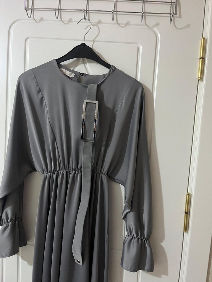 Tesettür abiye Gri Uzun Kollu Kemerli Elbise