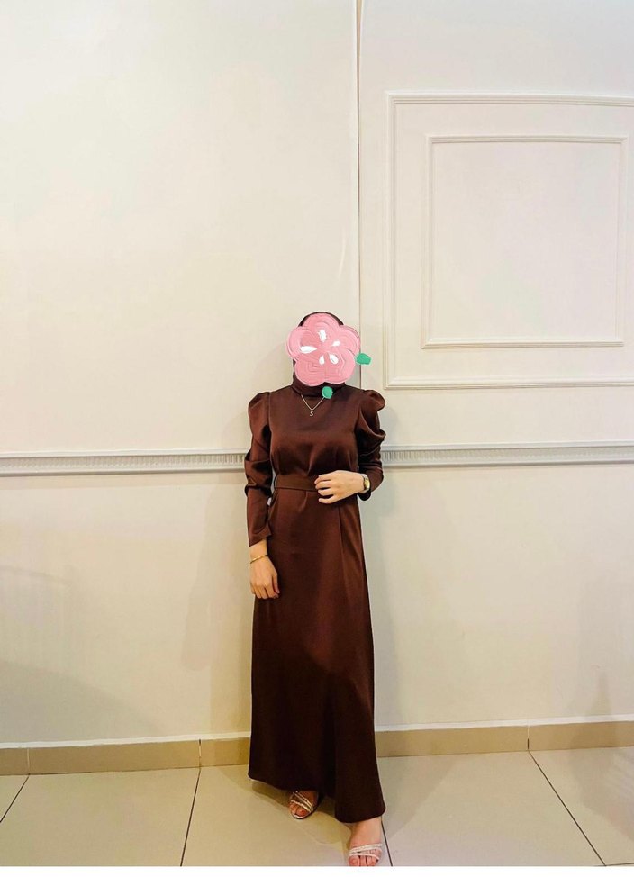 Bu ince kesim uzun elbise, yüksek yakalı ve uzun kolludur. Saten kumaştan, drapeli tasarıma sahiptir. Koyu kahverengi az kullanım temiz ürün