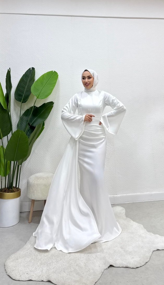 Uzun beyaz gelinlik, yüksek yaka ve uzun kollu, drapeli tasarıma sahiptir. Tesettürlü ve modern bir görünüm sunar, düzenli kesimlidir. İç gösterir içlikle giyilmesi gerekir.