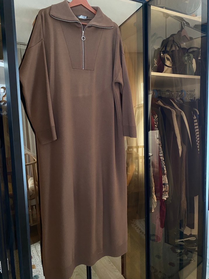 Tesettür acı kahve önğ fermuarlı triko elbise