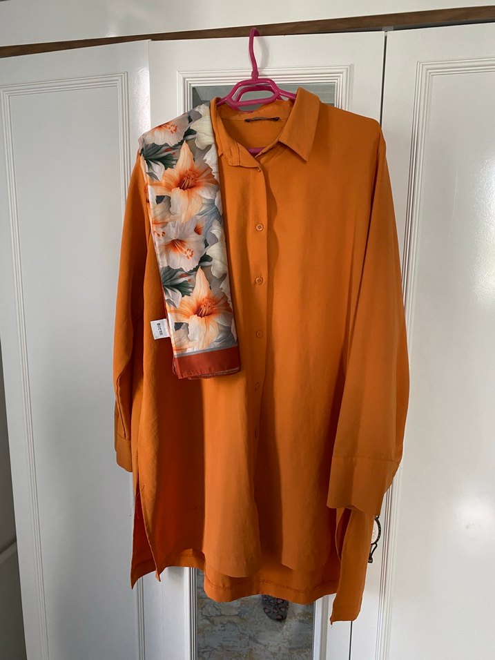 Bu kadın gömleği, yakalı ve uzun kollu, bol kesimlidir. Şal hediyedir
