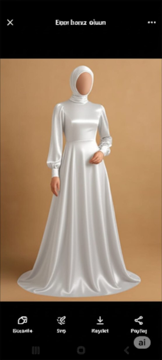 Uzun beyaz elbise, yüksek yakalı ve uzun kollu, drapeli tasarıma sahip. Parlak yüzeyi ve regular kalıbı ile mütevazı düğünler için uygun.