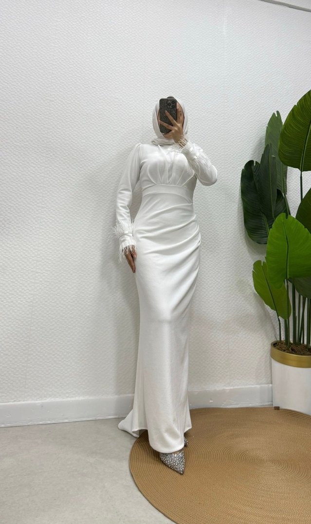 Uzun kollu, drapeli beyaz abiye elbise. V yaka ve kuğu tüyü detaylı kollarıyla klasik zarafeti yansıtıyor. 40-42-44 uyumludur