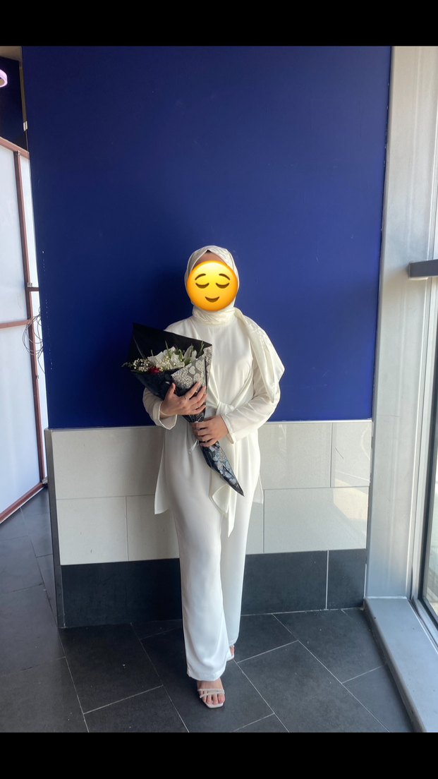 Beyaz renkte, midi boyda hamile jumpsuit. Yüksek yakalı, uzun kollu ve düzenli kesim. Dökümlü, ipeksi kumaş, sade ve mütevazı tasarım. Düğün için uygun. 2 kere giydim