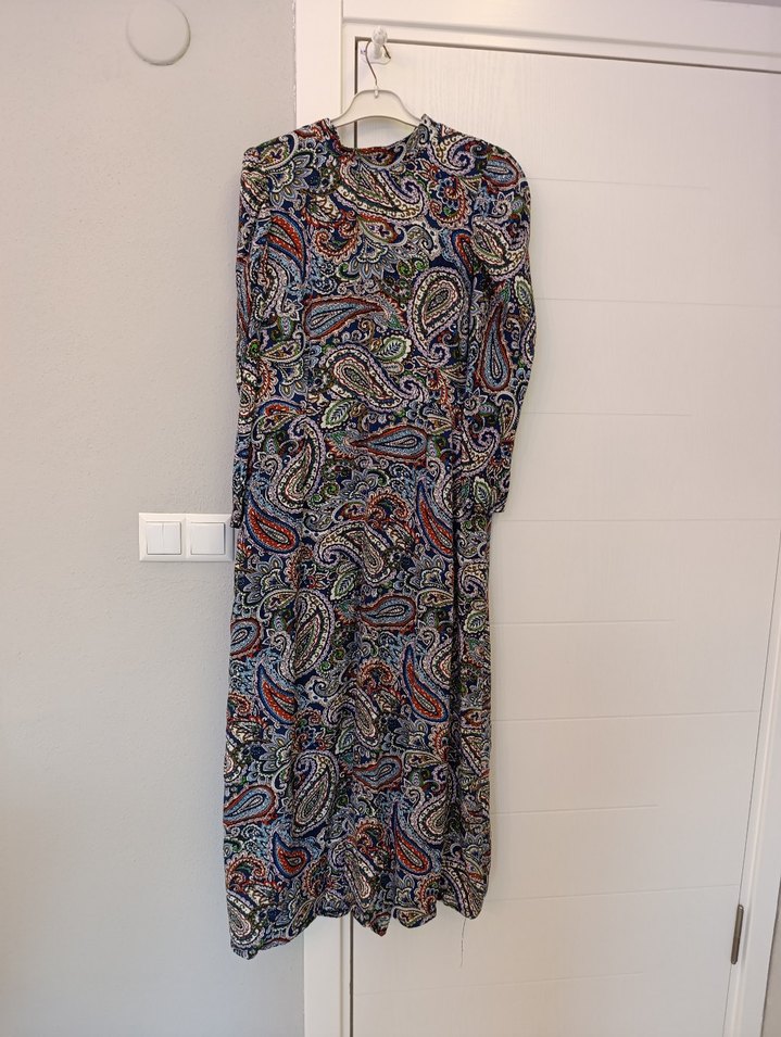 Bu uzun elbise, koyu renkli çok renkli bohem desenli, bol kesim ve tasarıma sahiptir. Uzun kollu ve dik yakalı, yumuşak pamuklu viskon kumaştan günlük kullanım için uygundur. 42 bedene göre dikilmiştir standarttır özel dikim standart bedene göre dikilmiştir